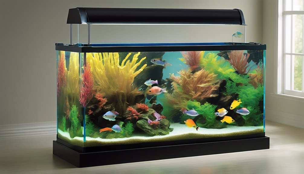 Aby naśladować naturalne środowisko w swoim akwarium o pojemności 240L, użyj lamp fluorescencyjnych T5, takich jak 54W Sylvania Grolux lub Aquastar, dążąc do temperatury barwowej w okolicach 6500K. To naśladuje naturalne światło słoneczne, wspierając zdrowy wzrost roślin i żywe kolory ryb. Połącz ciepłe i zimne diody LED, aby stworzyć zrównoważoną spektrum, idealnie celując w 100-110 watów dla umiarkowanych potrzeb roślin. Umieść światła centralnie, zapewniając równomierne oświetlenie, aby zredukować cienie. Użyj timerów, aby symulować cykle wschodu i zachodu słońca, co zmniejsza stres u twojego życia wodnego. Jest wiele więcej, co możesz zbadać, aby stworzyć idealne podwodne siedlisko dla swoich ryb i roślin.
