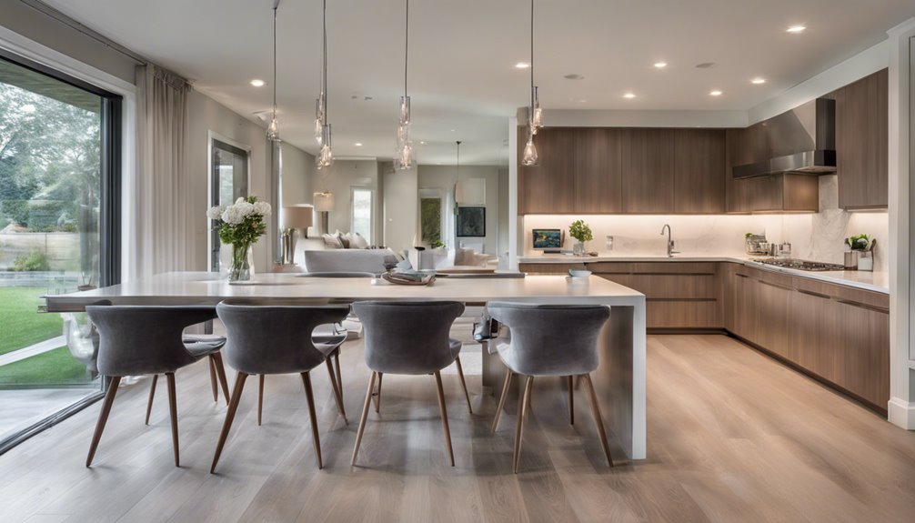 Aby stworzyć spójną i estetyczną przestrzeń w swoim salonie i kuchni, użyj warstwowego oświetlenia, które łączy ogólne, robocze i akcentujące opcje. Zacznij od opraw sufitowych dla ogólnego oświetlenia i dodaj oświetlenie podszafkowe w kuchni do praktycznych zadań. Wybierz ciepłe temperatury barwowe dla strefy wypoczynkowej i neutralne odcienie dla kuchni, aby płynnie połączyć te przestrzenie. Wprowadź przyciągające wzrok elementy dekoracyjne, takie jak lampy wiszące nad wyspami kuchennymi i stołami jadalnymi. Spójne materiały i style zwiększają przepływ i tworzą harmonię. Odkryj więcej pomysłów, aby podnieść swoje wybory oświetleniowe i zrealizować swoją wizję projektową.