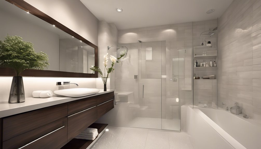 Aby osiągnąć idealne oświetlenie w toalecie, musisz skupić się na jasności, bezpieczeństwie i estetyce. Zainstaluj oprawy odporne na wilgoć o klasie IP44 lub wyższej w obszarach mokrych. Użyj zimnych żarówek do czynności związanych z pielęgnacją, szczególnie wokół luster, gdzie kinkiety na wysokości oczu zapewniają optymalne oświetlenie. Rozważ płaskie oprawy sufitowe lub minimalistyczne wzory, aby zaoszczędzić miejsce, zachowując jednocześnie uporządkowany wygląd. Ciepłe światło może poprawić nastrój, ale upewnij się, że jest wystarczająco jasne do funkcjonalności. Starannie dobierając style, które harmonizują z Twoim wystrojem, tworzysz spójną i przyjemną przestrzeń. Bądź na bieżąco, aby odkryć więcej wskazówek dotyczących idealnego oświetlenia toalety!