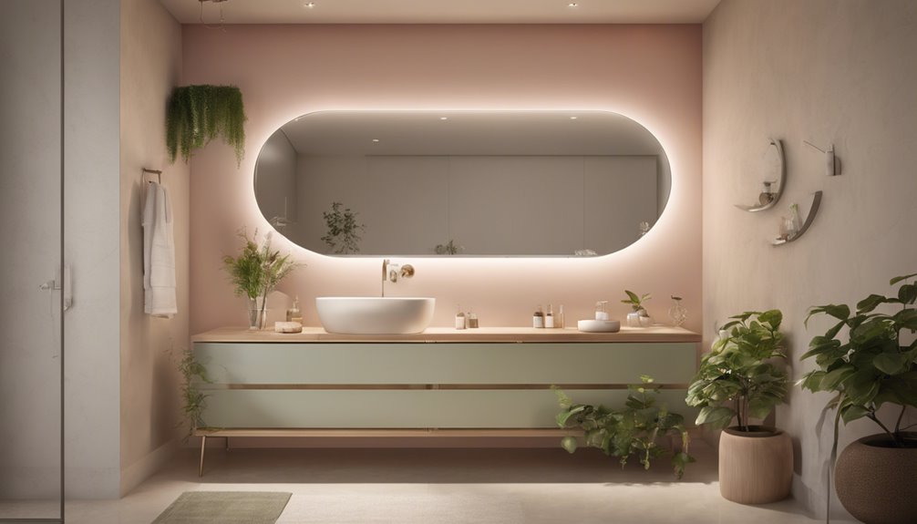 Aby uzyskać efektywne oświetlenie nad lustrem w łazience, rozważ użycie kinkietów lub wbudowanego oświetlenia LED. Kinkiety umieszczone na wysokości oczu minimalizują cienie, zapewniając równomierne oświetlenie do zadań pielęgnacyjnych. Dąż do intensywności światła na poziomie około 500 luksów oraz temperatury barwowej między 4000K a 5000K dla dokładnej reprezentacji kolorów. Jeśli masz większe lustro, wybierz oprawy sufitowe, aby wypełnić wszelkie luki świetlne. Lustra podświetlane mogą również poprawić atmosferę, jednocześnie pięknie oświetlając twoją twarz. Taki układ nie tylko zwiększa widoczność, ale także przyczynia się do przyjemnej atmosfery. Odkryj więcej opcji, które mogą podnieść jakość twojego doświadczenia w łazience.