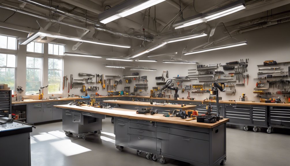 Kiedy mowa o oświetleniu warsztatu, znajdziesz kilka skutecznych opcji, aby poprawić swoje miejsce pracy. Dwa główne typy to oświetlenie ogólne i oświetlenie zadaniowe. Oświetlenie ogólne zapewnia ogólną iluminację, podczas gdy oświetlenie zadaniowe koncentruje się na konkretnych obszarach, gdzie potrzebujesz lepszej widoczności do szczegółowej pracy.